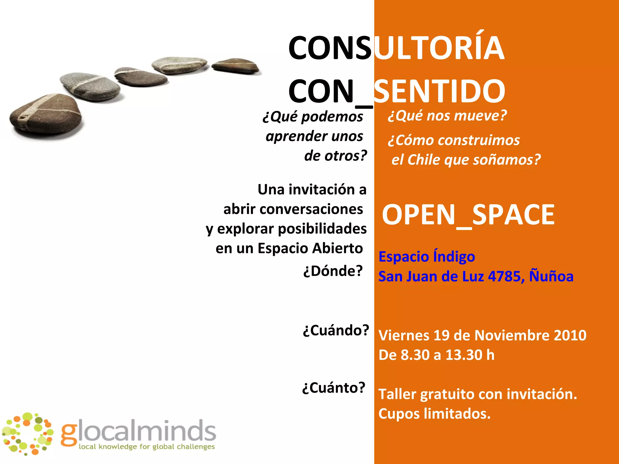 El documento presenta una serie de preguntas sobre el tema de la "Consultoría con Sentido" que se discutirán en un taller. Algunas de las preguntas clave son: ¿Qué es la Consultoría con Sentido y cómo se logra?, ¿Cuál debe ser el rol del consultor o facilitador?, ¿Cómo integrar conceptos como el cuerpo, la espiritualidad y la cultura de paz en la consultoría? El documento también propone algunos principios para alinear los sentidos entre el cliente y el consultor.