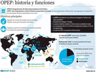 La Organización de Países Exportadores de Petróleo (OPEP) se formó en 1960 en Bagdad para coordinar y unificar las políticas petroleras de sus miembros. La OPEP busca garantizar un abastecimiento eficiente y económico de petróleo a nivel mundial, así como retornos justos para los países productores e inversionistas. Actualmente tiene 12 países miembros y trabaja para estabilizar los precios del petróleo ante la incertidumbre económica mundial.