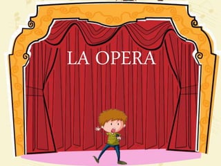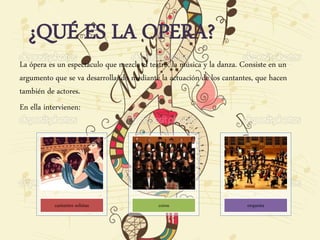 La ópera es un espectáculo que combina música, canto, teatro y danza en el que los cantantes interpretan un argumento musical. Nació en Italia en el siglo XVI como una forma de revivir la tragedia griega y alcanzó su madurez en la obra de Monteverdi "Orfeo" en 1607. Grandes compositores como Mozart, Rossini, Wagner y Verdi elevaron el género operístico y crearon obras maestras que todavía se representan hoy en día.