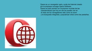 El documento describe el navegador web Opera creado por la empresa noruega Opera Software. Opera ha sido pionero en incorporar características como el zoom y las pestañas que ahora se usan ampliamente. Opera Mini es la versión más ligera para teléfonos móviles y fue el navegador más popular de su tipo en 2011, mientras que la versión de escritorio tiene mayor aceptación en países como Ucrania.