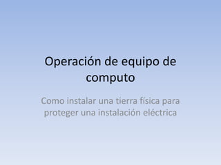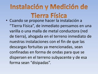 El documento explica cómo instalar una tierra física para proteger una instalación eléctrica. Menciona que una red de tierra de metal enterrada en el suelo debe disipar las descargas eléctricas, pero que existen zonas donde el voltaje no se reduce a cero y representa un riesgo. También describe los componentes principales de una computadora e incluye dispositivos de entrada y salida.