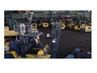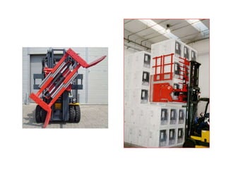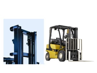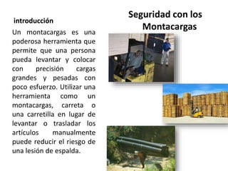 El documento proporciona información sobre la operación segura de montacargas. Explica los principios físicos como el torque y la inercia que permiten levantar cargas pesadas. También describe los riesgos asociados con la operación como los aplastamientos y caídas, y recomienda que los operadores reciban capacitación adecuada. Además, discute problemas ergonómicos como la mala visibilidad y las vibraciones, y la importancia de un diseño que minimice los riesgos y la fatiga del operador.