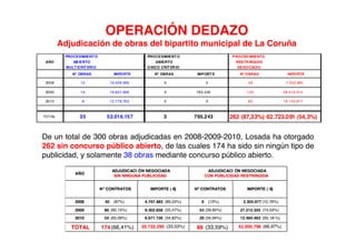 El documento describe las irregularidades en la adjudicación de obras públicas por el bipartito municipal de La Coruña entre 2008 y 2010. Específicamente, 262 de 300 obras (87%) fueron adjudicadas a dedo sin concurso público, principalmente a tres empresas vinculadas a políticos locales. Estas empresas recibieron más de 17 millones de euros en contratos durante ese periodo.