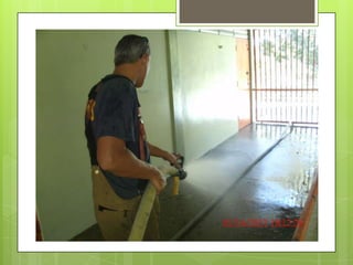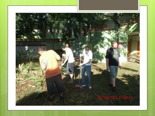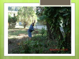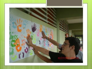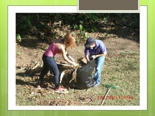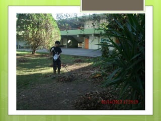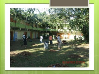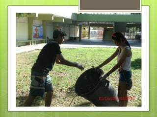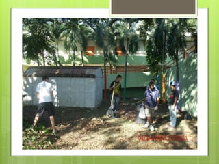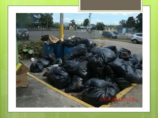 El documento habla sobre la falta de compromiso con el ambiente escolar. Explica que el ambiente escolar es el espacio para el desarrollo y las relaciones interpersonales. También define la basura como desperdicios como restos de comida y envases. Luego muestra imágenes de antes, durante y después para ilustrar el problema de la basura en la escuela.