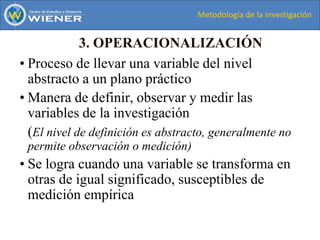 El documento habla sobre la operacionalización de variables de investigación. Explica que la operacionalización es el proceso de llevar una variable del nivel abstracto a un plano práctico mediante la definición, observación y medición de las variables. Este proceso implica descomponer las variables principales en dimensiones más específicas e indicadores que permitan la observación directa y medición de las variables. Además, provee un ejemplo de cómo operacionalizar la variable de "crecimiento".