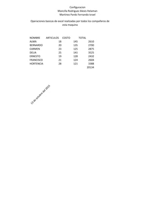 La tabla muestra el nombre de 7 personas, el número de artículos que compraron, el costo por artículo y el costo total de la compra. El documento también indica que fue generado el 13 de octubre de 2015 y contiene operaciones básicas de Excel.