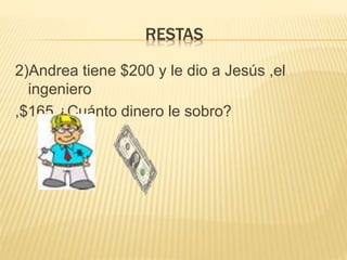 Matías tiene $82 y Camila tiene $75. Juntos quieren comprar una pelota de $200. Al juntar su dinero obtendrían $82 + $75 = $157, por lo que no alcanzaría el precio de la pelota. Andrea tenía $200 y le dio $165 a Jesús. Por lo que le sobraría $200 - $165 = $35.
