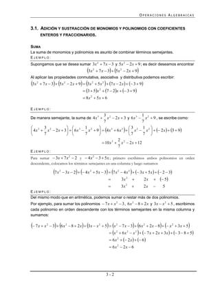 Este documento presenta los conceptos básicos de las operaciones algebraicas de adición, sustracción, multiplicación y división de monomios y polinomios. Explica cómo combinar términos semejantes en la suma y resta de polinomios, y cómo aplicar las leyes de los exponentes en la multiplicación y división. También introduce conceptos como el producto notable y la factorización de polinomios.