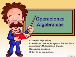 Este documento describe conceptos básicos de álgebra como operaciones, signos, expresiones y términos algebraicos. Explica que las letras representan cantidades desconocidas y las operaciones de suma, resta, multiplicación y división. También cubre temas como el orden de operaciones, términos semejantes y grado de polinomios.