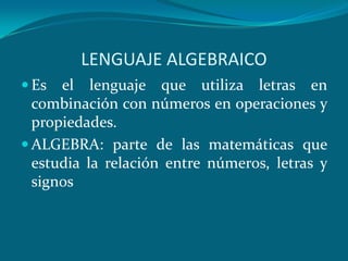 El documento resume conceptos básicos de operaciones algebraicas como el lenguaje algebraico, ejemplos de suma, resta, multiplicación y división algebraica. Explica cómo se representan expresiones algebraicas y cómo se realizan operaciones con términos semejantes y polinomios.