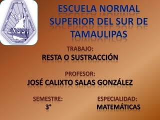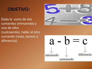 Este documento presenta los conceptos y operaciones básicas de la resta. Explica las leyes de la resta como la ley de uniformidad y la ley de monotonía. Luego, describe cómo realizar operaciones indicadas de suma y resta siguiendo las propiedades de estas operaciones, incluyendo sumar y restar números, sumas y diferencias indicadas. Finalmente, presenta algunos casos particulares como que la suma de dos números más su diferencia es igual al doble del mayor.