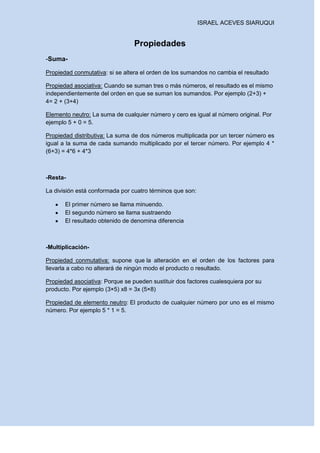 La aritmética estudia cuatro operaciones básicas: suma, resta, multiplicación y división. La suma involucra agregar números, la resta quitar números, la multiplicación repite sumas, y la división reparte cantidades en partes iguales. Cada operación tiene propiedades como conmutatividad, asociatividad, y elementos neutros que afectan cómo se aplican y los resultados.