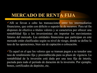 El documento habla sobre el mercado de renta fija, donde las entidades financieras realizan transacciones de valores que ofrecen una rentabilidad fija. Explica que este mercado clasifica a las entidades según su riesgo y define las tasas de operaciones. También menciona que la rentabilidad de la inversión depende de una tasa fija acordada para el período de la inversión, como en bonos y certificados de depósito.