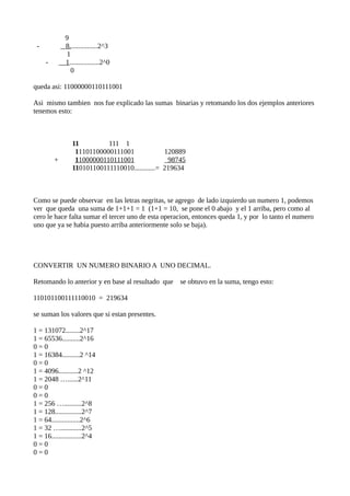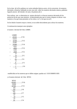 La profesora explicó métodos para convertir números decimales a binarios usando la suma de potencias de 2. Los estudiantes aprendieron a determinar las potencias de 2 menores al número decimal y restarlas hasta llegar a cero, asignando un 1 a las potencias presentes y un 0 a las ausentes. Luego practicaron sumas binarias con dos ejemplos.