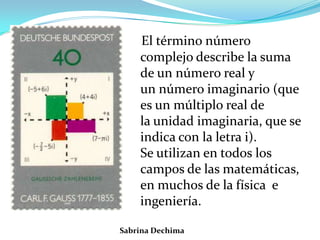 Los números complejos son la suma de un número real y un número imaginario, esenciales en matemáticas, física e ingeniería. Se utilizan para describir fenómenos como campos electromagnéticos y estados de circuitos eléctricos. El documento también aborda potencias especiales y la multiplicación de números complejos mediante el uso del conjugado del denominador.
