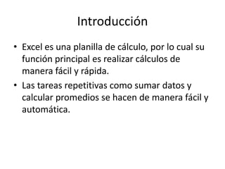 Excel puede utilizarse para realizar cálculos matemáticos de manera fácil y rápida mediante operaciones básicas como suma, resta, multiplicación y división, y funciones predefinidas. Las operaciones básicas en Excel comienzan con el signo = seguido de la operación y los números o celdas. Funciones como promedio y suma pueden utilizarse para automatizar cálculos repetitivos sobre rangos de celdas.