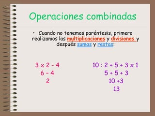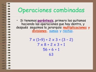 El documento explica cómo resolver operaciones combinadas siguiendo la jerarquía de operaciones. Indica que primero se resuelven las operaciones dentro de los paréntesis y luego se realizan las multiplicaciones y divisiones antes que las sumas y restas. Además, incluye varios enlaces a páginas web con ejercicios de práctica de operaciones combinadas.
