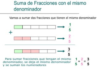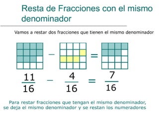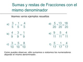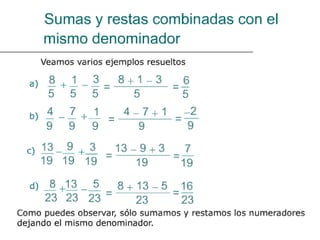 Este documento describe diferentes operaciones con fracciones, incluyendo cómo sumar y restar un número y una fracción transformando el número a una fracción con el mismo denominador, multiplicar fracciones multiplicando los numeradores y denominadores, dividir fracciones multiplicando por la fracción inversa, y dividir un número por una fracción transformando el número a una fracción con denominador 1.