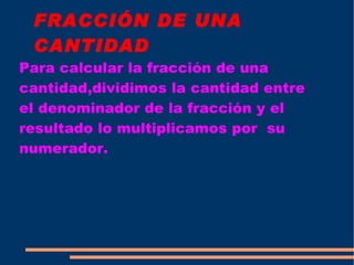 Este documento resume diferentes operaciones con fracciones, incluyendo calcular la fracción de una cantidad, sumar y restar fracciones con el mismo denominador, multiplicar un número por una fracción, sumar y restar fracciones con distinto denominador, multiplicar fracciones, y dividir fracciones. Explica los pasos para realizar cada operación, como dividir la cantidad por el denominador y multiplicar por el numerador para calcular la fracción de una cantidad, y reducir fracciones a un denominador común antes de sumar o restar cuando tienen denominadores diferentes.