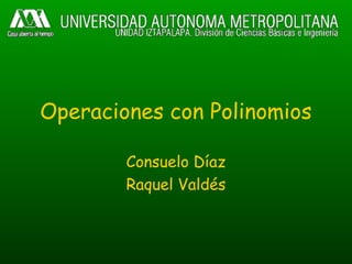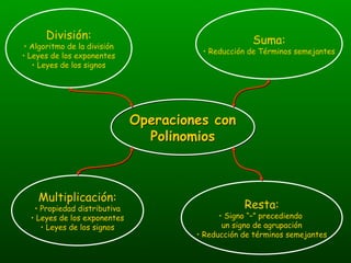 El documento habla sobre operaciones con polinomios como suma, resta, multiplicación y división. Explica que la suma y resta implican reducir términos semejantes, mientras que la multiplicación usa la propiedad distributiva y las leyes de exponentes. La división sigue el algoritmo de división numérica y también usa las leyes de exponentes.