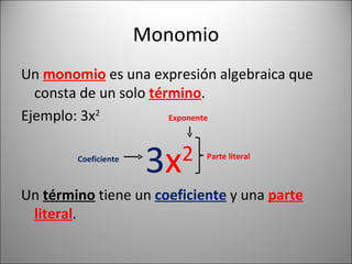El documento explica los conceptos básicos de polinomios, incluyendo monomios, polinomios, sumas, restas, multiplicaciones y divisiones de polinomios. Define un monomio como una expresión algebraica con un solo término y un polinomio como dos o más monomios. Explica cómo realizar operaciones como sumar términos semejantes y cambiar los signos al restar polinomios. También describe cómo se suman exponentes al multiplicar monomios y cómo dividir monomios y polinomios siguiendo las leyes de