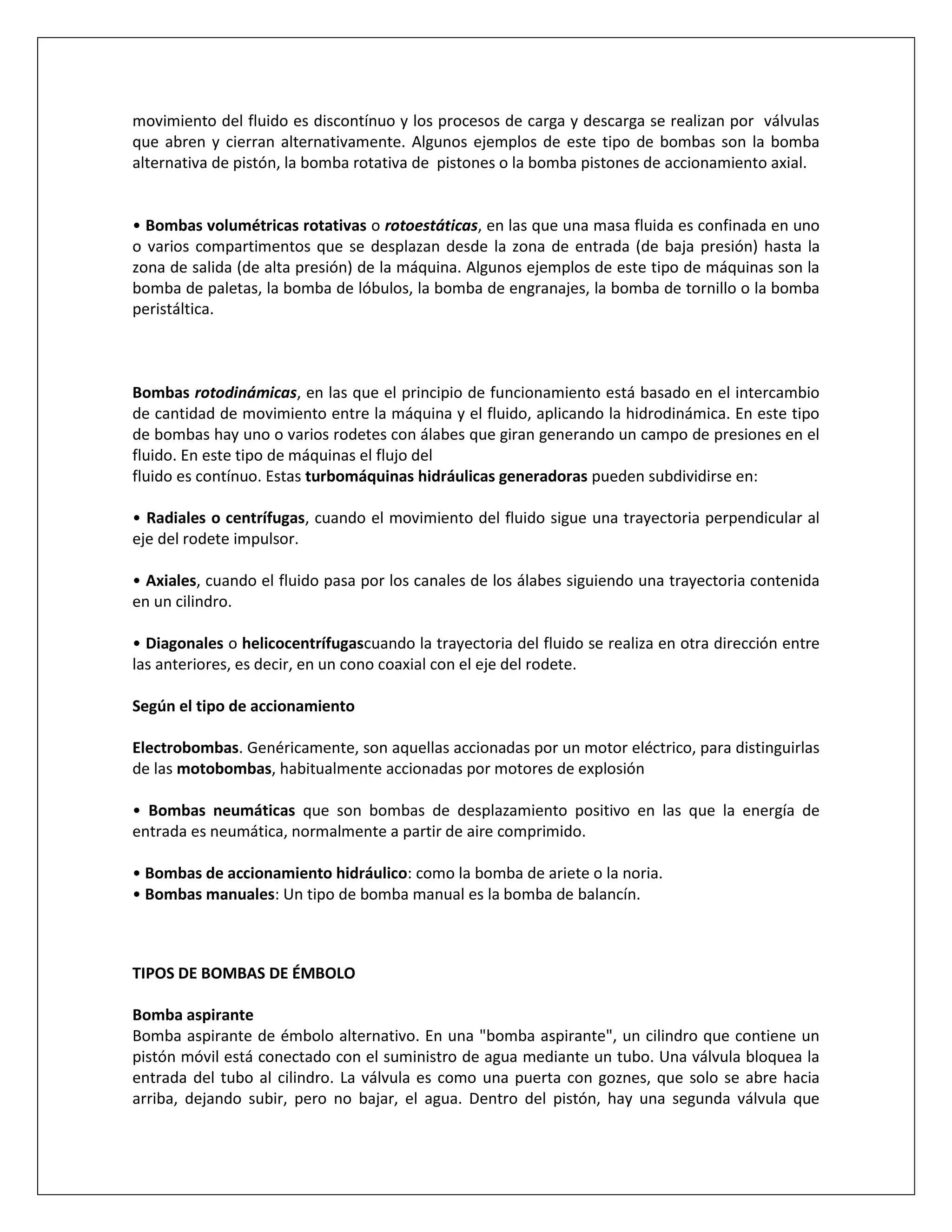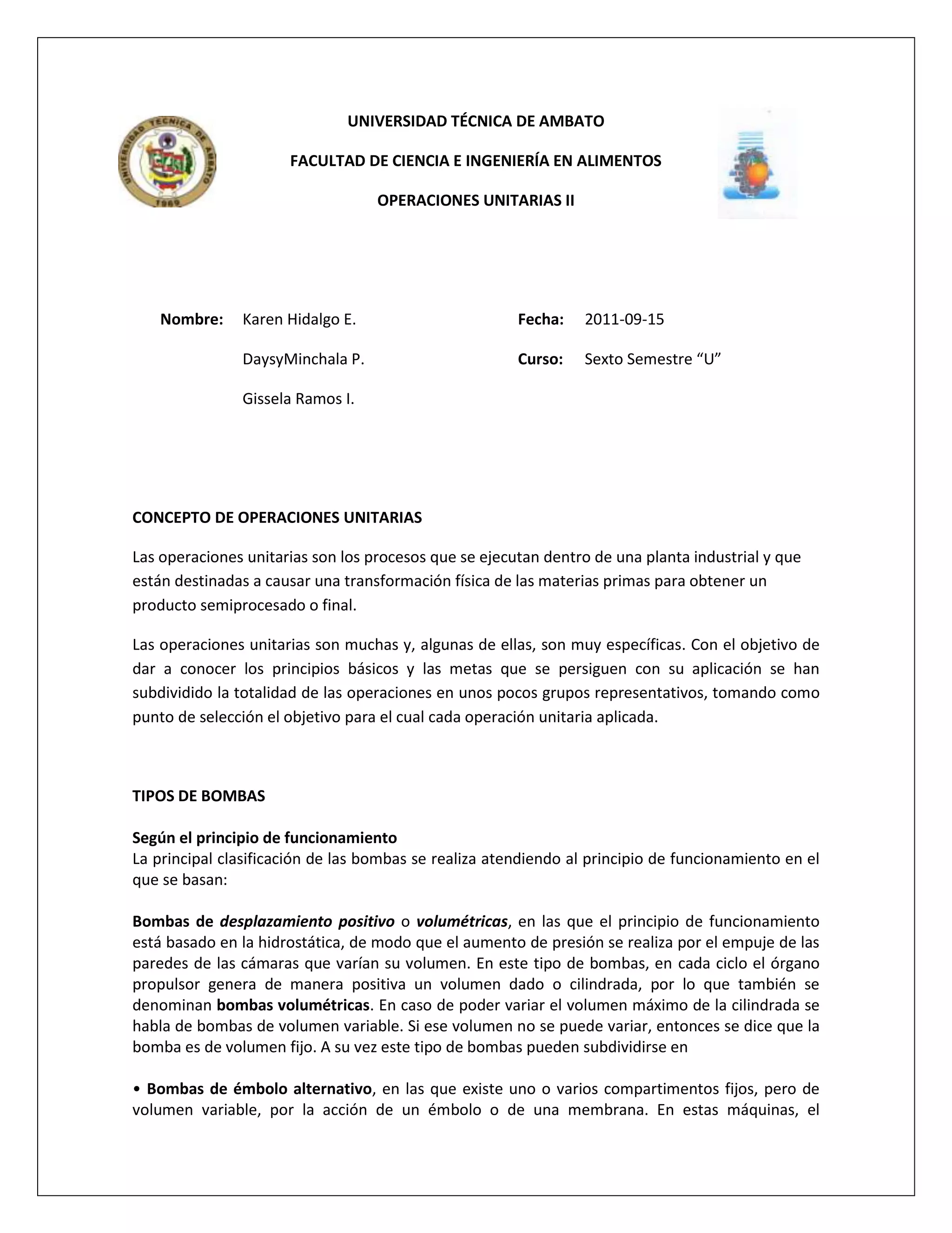 El documento presenta información sobre diferentes tipos de bombas, operaciones unitarias, número de Reynolds, flujo laminar y turbulento, Clostridium botulinum, y la reacción de Maillard. Explica que las bombas se clasifican según su principio de funcionamiento en bombas de desplazamiento positivo y bombas rotodinámicas. También describe brevemente bombas de émbolo, centrífugas e impelentes. Además, define flujo laminar, transicional y turbulento, y presenta detalles sobre Clostridium botulinum