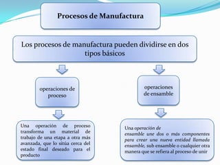 Este documento describe los diferentes tipos de procesos de manufactura, incluyendo operaciones de proceso y de ensamble. Las operaciones de proceso transforman materiales mediante formado, mejora de propiedades o procesado de superficies. Incluyen procesos como fundición, forjado, maquinado, tratamientos térmicos y limpieza/recubrimiento de superficies. Las operaciones de ensamble unen componentes para crear un producto final.