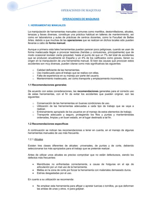 Este documento proporciona recomendaciones sobre el uso seguro de herramientas manuales y máquinas portátiles. Describe varios tipos de herramientas manuales comunes como alicates, destornilladores, limas y llaves, e indica cómo usar cada una de forma segura. También cubre máquinas portátiles accionadas por energía eléctrica, neumática o hidráulica. El objetivo es prevenir lesiones mediante el uso adecuado de estas herramientas y máquinas.
