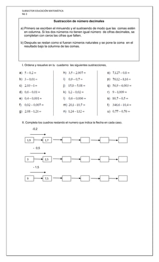 El documento proporciona instrucciones sobre cómo realizar operaciones con números decimales, incluida la adición y sustracción. También incluye ejercicios para practicar estas operaciones colocando los números correctamente, sumando y restando, y comparando números decimales. Finalmente, presenta una guía de estudio con preguntas sobre lectura, escritura, comparación y ordenación de números decimales.