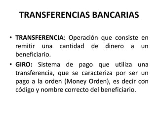 El documento proporciona información sobre diferentes tipos de operaciones bancarias, incluyendo transferencias bancarias, emisión de tarjetas de crédito y débito, pagos de servicios, y préstamos. Explica conceptos como transferencias, giros, códigos bancarios internacionales, y trámites de transferencias. También cubre temas como estados de cuenta, abonos a préstamos, forwards, futuros, opciones y swaps.