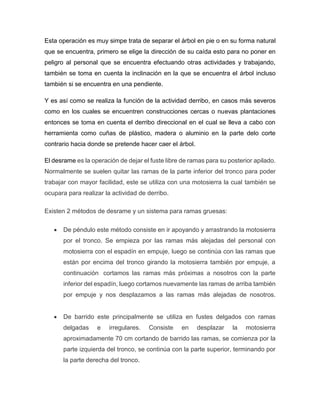 El documento describe las operaciones de abastecimiento forestal, incluyendo el derribo de árboles y el desrame. Estas actividades requieren personal capacitado y se llevan a cabo de manera cuidadosa para extraer los recursos forestales de manera eficiente y minimizar el impacto ambiental. El derribo requiere considerar factores como el costo, peligros y tiempo de crecimiento del árbol. El desrame implica quitar las ramas del tronco usando una motosierra y existen dos métodos para esto: el método de pénd