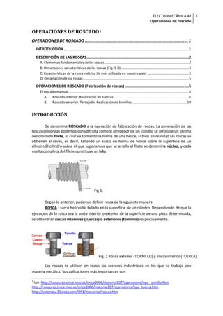 Este documento describe las operaciones de roscado. Explica los elementos fundamentales de las roscas como el filete y el hilo, y sus dimensiones características como el paso, profundidad y diámetro. Describe los diferentes tipos de roscas según su perfil, sentido de la hélice y número de filetes. Además, detalla el proceso de roscado manual para fabricar tuercas y tornillos, utilizando herramientas como machos y terrajas. Finalmente, resume la importancia de las roscas en la unión de piezas mecánicas
