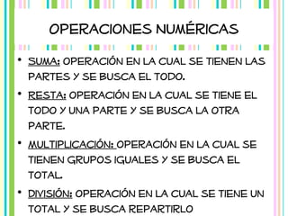 Este documento describe conceptos y estrategias matemáticas fundamentales para la educación temprana, incluyendo las cuatro operaciones básicas, formas de representar problemas, tipos de problemas de suma y resta, estrategias para la suma, resta, multiplicación y división, y conceptos básicos de fracciones.