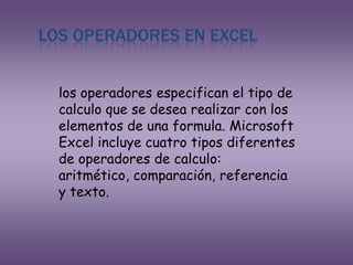 Este documento describe los diferentes tipos de operadores y funciones en Excel. Explica que los operadores especifican el tipo de cálculo a realizar en una fórmula y clasifica los operadores en aritméticos, de comparación, de referencia y de texto. También indica que las funciones permiten realizar operaciones más complejas de forma sencilla con valores numéricos y de texto, y que se clasifican en funciones de fecha y hora, de texto y de búsqueda.