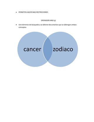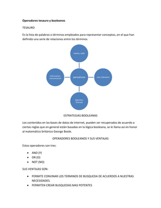 El documento describe los operadores tesauro y booleanos para realizar búsquedas de información. Explica que un tesauro es una lista de términos relacionados entre sí para representar conceptos, y que los operadores booleanos AND, OR y NOT permiten combinar términos de búsqueda de acuerdo con las necesidades del usuario para crear búsquedas más potentes y hacer más restricciones.