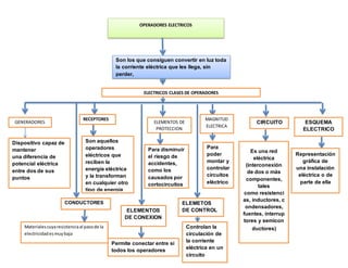 El documento describe los diferentes tipos de operadores eléctricos. Incluye generadores, que producen corriente eléctrica, receptores, que convierten la energía eléctrica en otra forma de energía, y conductores, que permiten el paso de la corriente eléctrica. También describe elementos de protección, conexión, control y medición que son parte integral de los circuitos eléctricos.