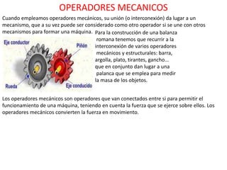 Este documento describe diferentes operadores mecánicos y máquinas simples. Explica que los operadores mecánicos se unen para formar mecanismos que permiten el funcionamiento de máquinas. Luego describe las máquinas simples como la palanca y la polea, indicando que transforman el movimiento al cambiar la magnitud, dirección o distancia de la fuerza aplicada. Finalmente, detalla los tres tipos de palancas y los tipos de poleas simples y compuestas.
