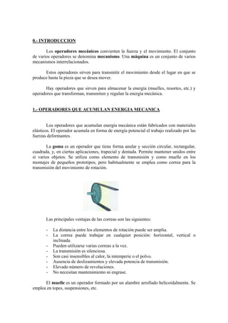 Este documento describe diferentes operadores mecánicos, incluyendo aquellos que acumulan energía como muelles y resortes, y aquellos que transmiten y transforman energía como palancas, poleas, engranajes y tornillos. También explica cómo funcionan y se utilizan estos operadores en máquinas e ingeniería mecánica.