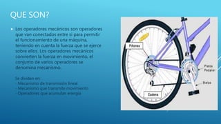 Los operadores mecánicos son elementos que se conectan en las máquinas para permitir su funcionamiento mediante la conversión y transmisión de fuerza en movimiento. Incluyen mecanismos de transmisión lineal como palancas y poleas que cambian la dirección o punto de aplicación de la fuerza, así como ruedas, ejes y cadenas que transmiten movimiento. También existen operadores como muelles y gomas que acumulan energía mecánica. En conjunto, los diversos operadores mecánicos permiten el funcionamiento de máquinas