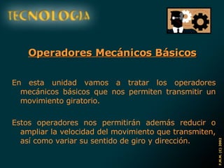 Este documento trata los operadores mecánicos básicos para transmitir movimiento, incluyendo ruedas de fricción, poleas y correas, y engranajes. Describe cómo cada operador puede transmitir movimiento de manera multiplicadora o reductora, y explica las ventajas e inconvenientes de cada uno.