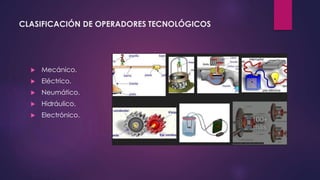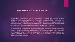 El documento aborda el desarrollo tecnológico de la humanidad a través del dominio y conversión de la energía en diversas formas mediante operadores. Se identifican cinco clases de operadores tecnológicos: mecánicos, eléctricos, neumáticos, hidráulicos y electrónicos, cada uno con funciones específicas. Se proporcionan ejemplos de cada tipo de operador, destacando su importancia en la transformación y aplicación de la energía.