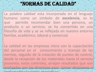 El documento describe la importancia de la calidad en las empresas, destacando la capacitación del personal y la implementación de controles para asegurarla. Se menciona la necesidad de polivalencia laboral y mejorar continuamente los procesos de fabricación, con énfasis en la eficiencia y la filosofía Kaizen. Además, se resalta que todos en la organización deben participar en el mejoramiento continuo para maximizar la satisfacción del cliente y la productividad.