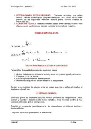 Este documento describe la programación lineal, un método de la investigación operativa que se puede aplicar cuando un problema se puede expresar mediante ecuaciones y desigualdades lineales. Explica conceptos como función objetivo, variables de decisión, restricciones, solución óptima y métodos de resolución como el gráfico. También presenta ejemplos ilustrativos de problemas de programación lineal y su solución.