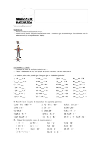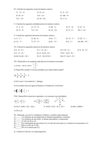 Este documento presenta una guía de ejercicios de matemáticas con el objetivo de reforzar conceptos básicos y fomentar el espíritu de superación. Incluye ejercicios de operaciones básicas, números enteros, racionales, proporciones y porcentajes. Se recomienda aprenderse las tablas de multiplicar y trabajar cada ejercicio, ya que serán evaluados.