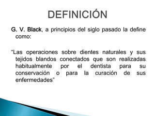 El documento define la operatoria dental como la disciplina odontológica que enseña a prevenir, diagnosticar y curar enfermedades dentales, así como a restaurar lesiones o defectos dentales para recuperar la forma, estética y función de los dientes. Describe los diferentes tipos de instrumentos utilizados en operatoria dental como instrumentos cortantes manuales e instrumentales rotatorios como fresas, piedras abrasivas y discos. Explica los materiales, formas y usos de estos instrumentos para realizar procedimientos odontológicos.