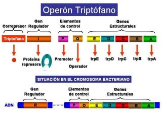 El documento describe los genes y el modelo operón. Un gen es una secuencia de ADN que contiene la información para sintetizar un polipéptido, enzima o ARN. El modelo operón explica cómo se regula la expresión génica en bacterias a través de operadores, promotores y genes reguladores y estructurales. Los operones pueden ser inducibles o reprimibles dependiendo del mecanismo de control.