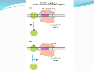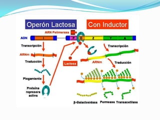 El documento describe el modelo del operón lac, que regula la expresión génica de los genes necesarios para metabolizar la lactosa en bacterias como E. coli. El operón lac contiene tres genes (lacZ, lacY, lacA) que producen enzimas para digerir la lactosa. Estos genes solo se expresan cuando está presente la molécula inductor llamada alolactosa. Sin ella, el represor lac impide la transcripción de los genes bloqueando al promotor.
