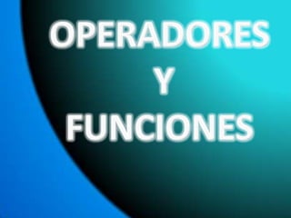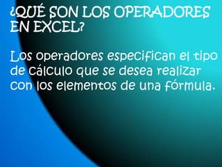 El documento describe los diferentes tipos de operadores y funciones en Excel. Explica que los operadores especifican el tipo de cálculo a realizar en una fórmula y clasifica los operadores en aritméticos, de comparación, de concatenación de texto y de referencia. También define las funciones como fórmulas predefinidas que operan sobre valores para producir un resultado y clasifica las funciones en de texto, fecha y hora, búsqueda, financieras, matemáticas, estadísticas, lógicas e información.