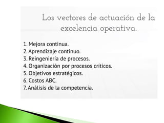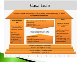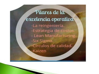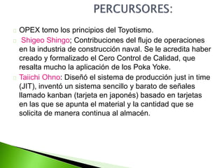 Este documento resume los principios del sistema de manufactura Toyota (Toyotismo) como el just in time (JIT) y kanban. Explica que la excelencia operacional (OPEX) busca mejorar continuamente la calidad a través de la planificación, procesos de fabricación y efectividad de personas y activos. Finalmente, compara Lean Manufacturing, que reduce desperdicios, y Six Sigma, que reduce variabilidad, como enfoques de mejora continua.