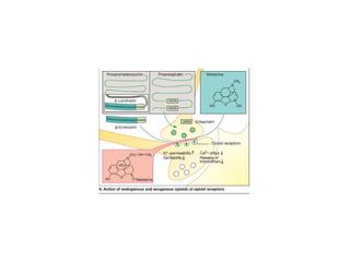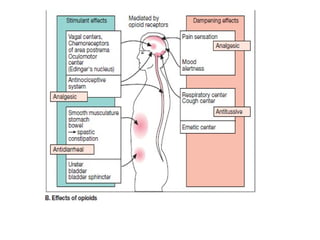 Este documento resume la farmacología de los analgésicos opiáceos. Explica que los opiáceos actúan uniéndose a receptores opioides en el cerebro y médula espinal. Los principales tipos de receptores son μ, δ y κ. Los opiáceos como la morfina, codeína y metadona actúan como agonistas del receptor μ y producen analgesia, depresión respiratoria y euforia. El desarrollo de tolerancia y dependencia está mediado por los receptores μ. Los antagonistas como la nal